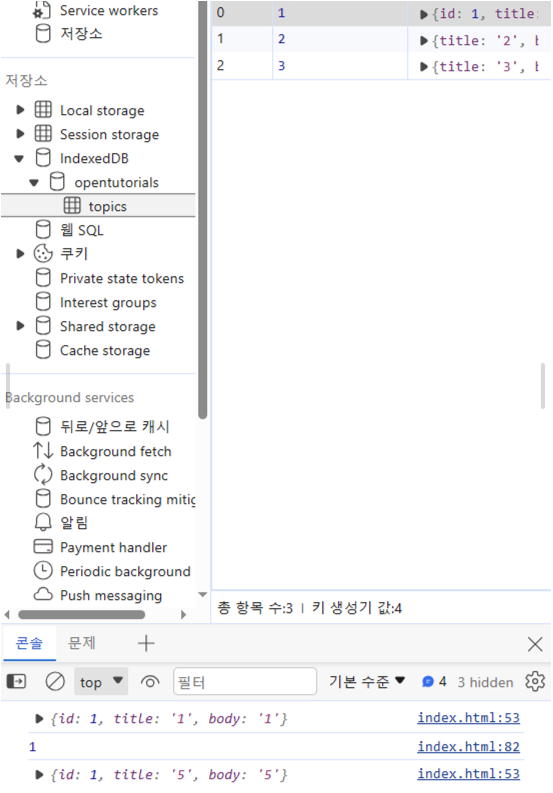 db는 ObjectStore 생성 당시 데이터베이스 레퍼런스 값을 주었다. transaction은 모드를 지정하여 특정 ObjectStore에 접근할 수 있도록 해준다. 첫 번째 매개변수로 ObjectStore의 이름, 두번째는 읽기, 쓰기 어떤 모드로 할 것인지 지정한다. 선택하지않을 시에는 readonly 모드로 열리게 된다. readwrite는 쓰기,읽기 전용 모드이다. 이렇게 참조된 ObjectStore에 add("객체")함수를 써서 데이터를 추가해준다. 추가가 완료되었을 때 success 이벤트가 작동하는 것을 볼 수 있다.