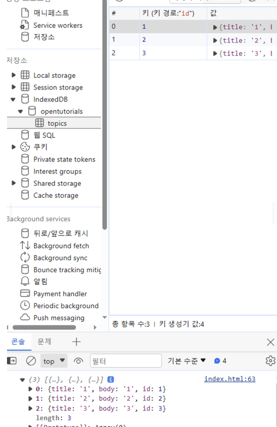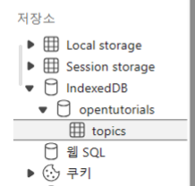 // topics라는 오브젝트스토어 생성, keyPath를 통해 오브젝트스토어 객체 식별이 가능
