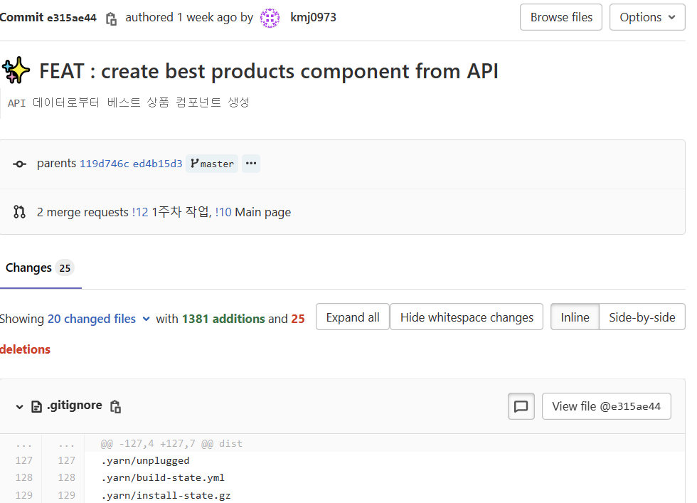 느낀점 백엔드 쪽에서 작성해주신 라우터들을 사용하는 방법을 깨우치게 되면서 api를 통해 서버에서 데이터를 가져오는 문제가 완전히 해결되었습니다. 역시 다른 분들이 한 코드를 살펴봤던 것이 매우 큰 도움이 되었던 것 같습니다. 개발에만 집중하다보니 협업도구에 이슈와 커밋을 자주 하지 못했던 부분이 있었습니다. 좀 더 활발한 이슈와 커밋을 작성이 필요하다는 것을 느꼈습니다.