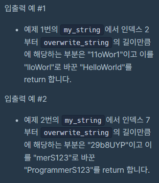 - 1 <= overwrite_string 의 길이 <= my_string 의 길이 <= 1,000
